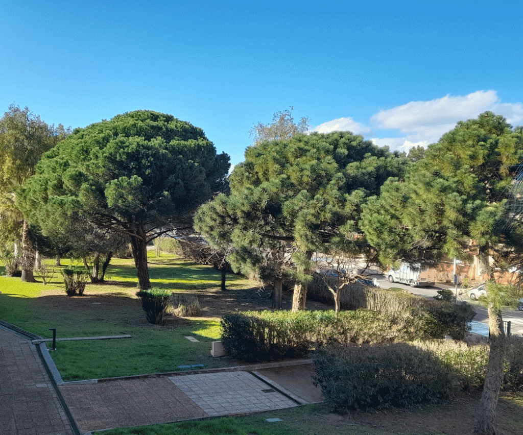 Ventilateur sur place. La terrasse étant couverte et équipée d’un store banne,, l’appartement est maintenu ombragé en été et vous pouvez profiter de la terrasse pour vos repas et la sieste sur chiliennes.